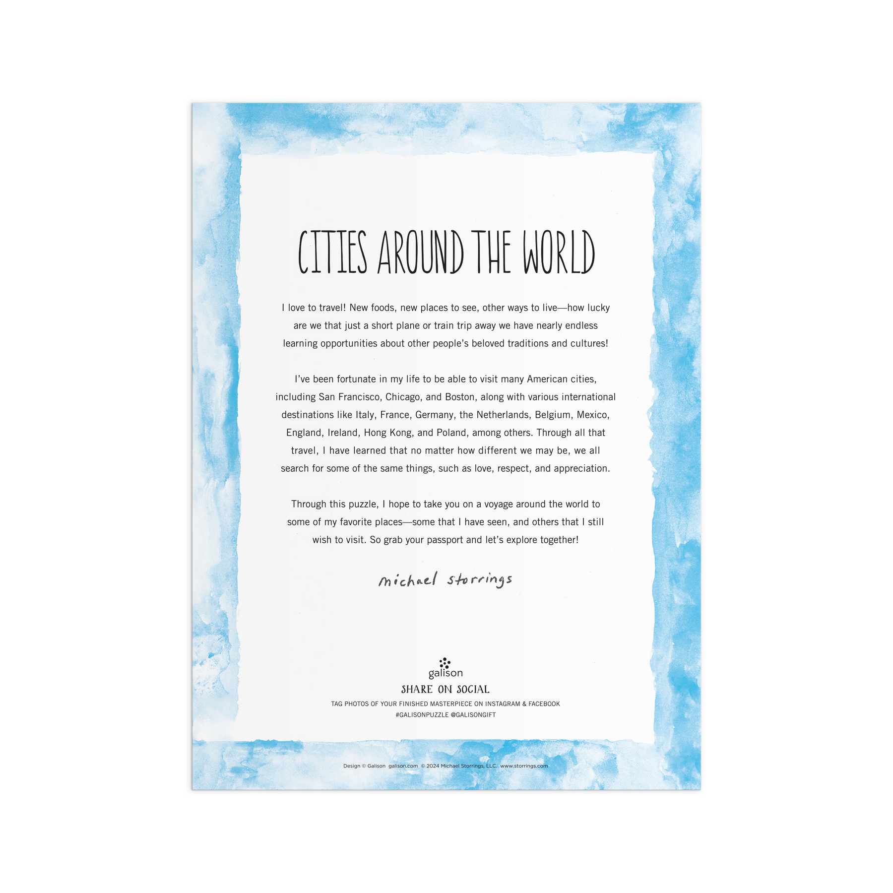 Explore the colorful and vibrant cities around the world, including New York, London, Paris, Athens & more, with the Michael Storrings Cities Around the World 1000 Piece Puzzle. This expertly crafted puzzle features stunning illustrations and 1000 pieces that provide hours of entertainment. Perfect for puzzle lovers of all ages.