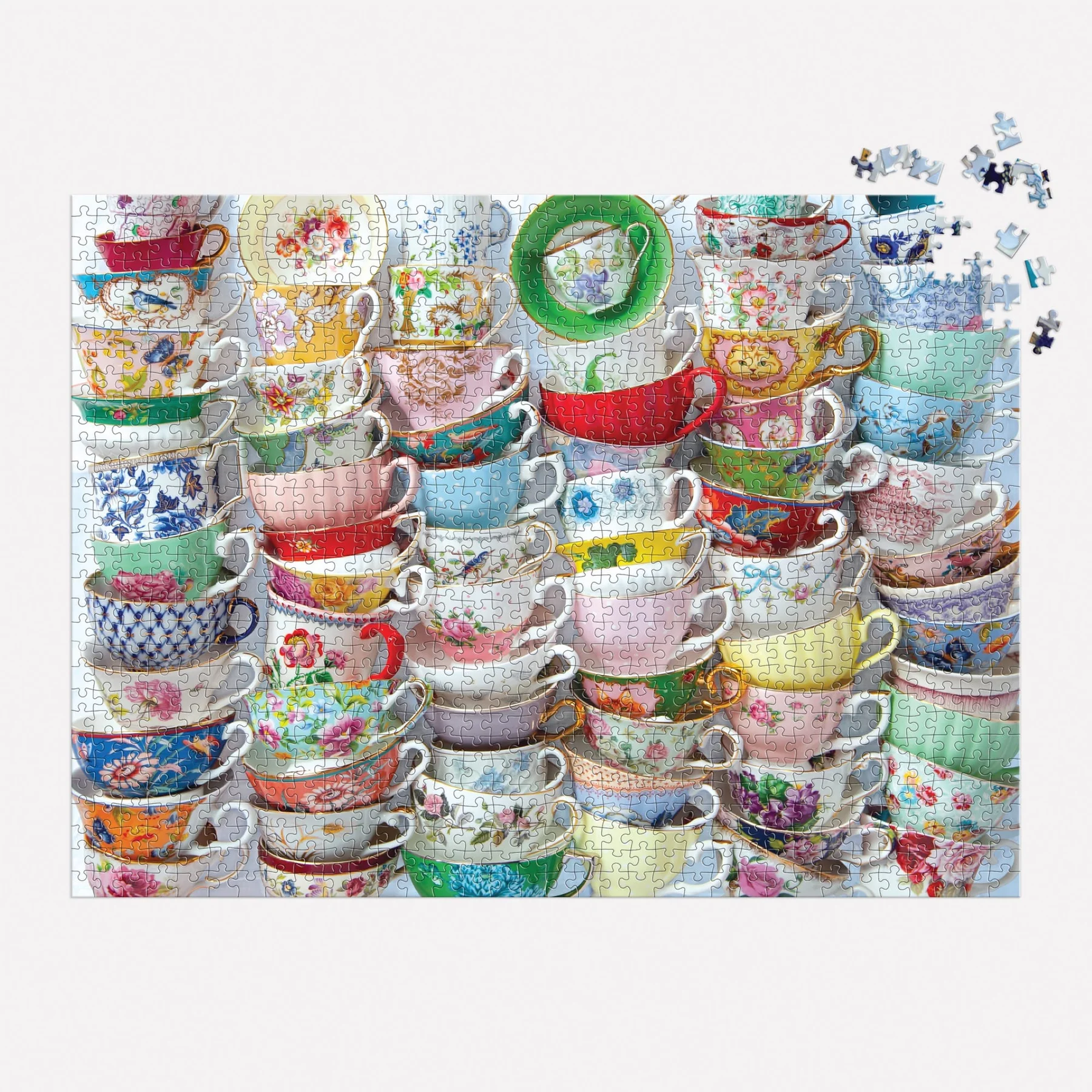 Teacups 1000 Piece Puzzle features a Regency core style mix of vibrant teacups, with patterns and details to make any tea party enthusiast proud.