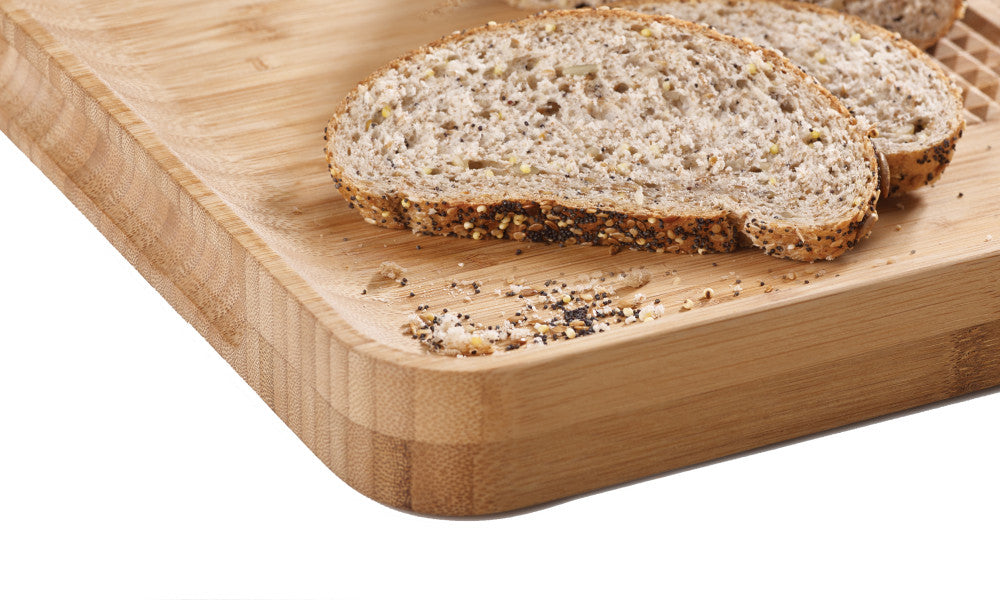 This heavy-duty chopping board is made from tough, natural bamboo and features an integrated food grip for holding meat, vegetable and bread whilst cutting. It has an angled cutting surface - to help catch meat juices and breadcrumbs - and easy-pour corners. Handle recesses on the sides make carrying easy and non-slip feet on the base help keep it in place whilst cutting. Its beautiful natural finish is complimented with an etched stainless-steel badge set into its front edge.