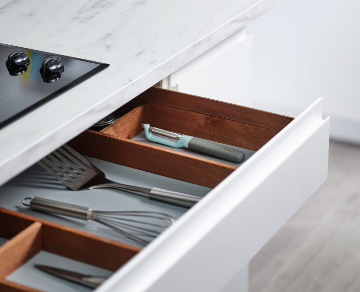 This slimline peeler has a sharp stainless-steel blade that swivels to follow the contours of fruit or vegetables, keeping the blade in contact at all times for faster peeling. It also features a non-slip, silicone handle and a handy tool for removing spots and blemishes.