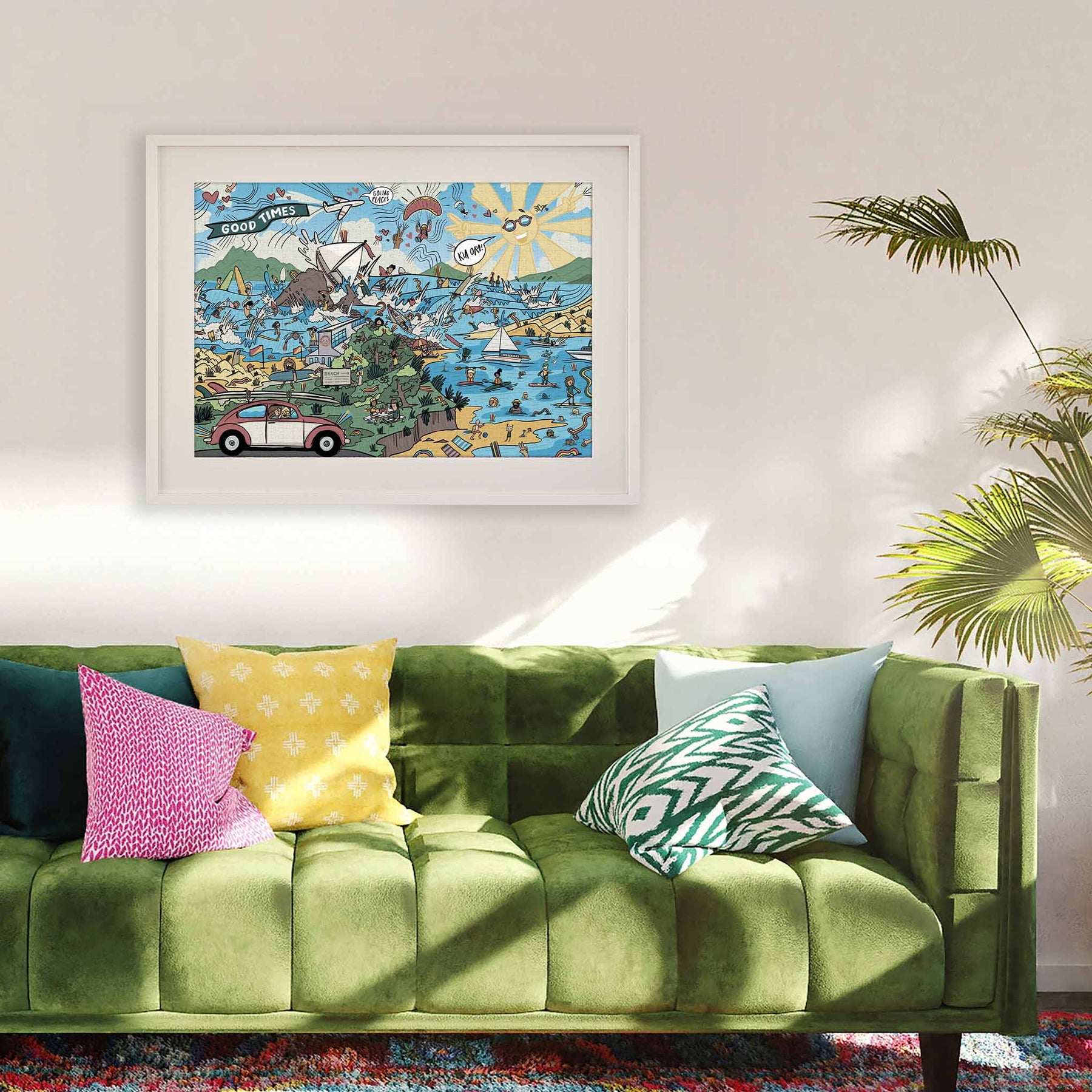 We’re never far from the water in New Zealand, and this action-packed scene celebrates a classic summer’s day. An explosion of sun, surf and sand, the crowds are soaking it up! What a Day For It.