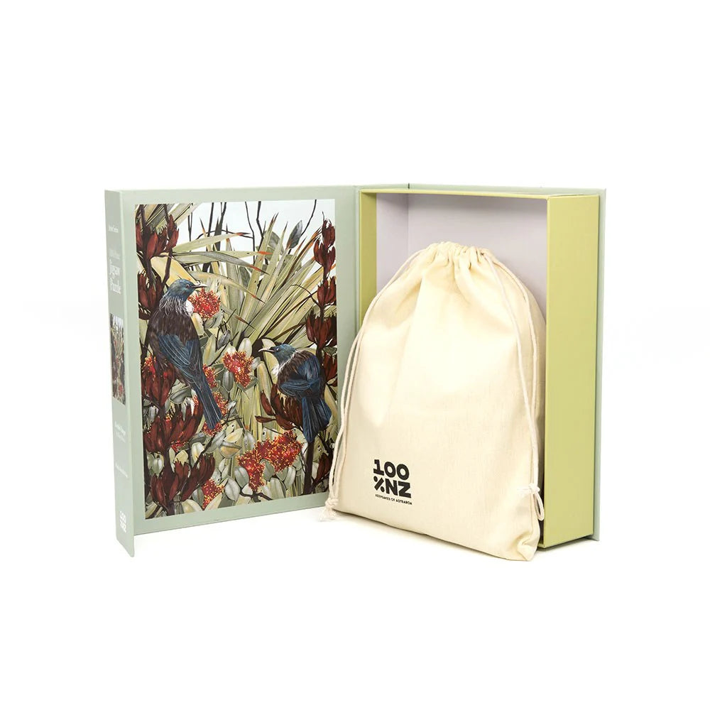 Discover the vibrant energy of New Zealand’s birdlife with our Artist Series 1000-piece jigsaw puzzle, Double Banger by Kirsty Nixon. This striking artwork portrays two Tūī perched on blooming red harakeke, surrounded by native foliage including pōhutukawa, tī kōuka, and tītoki. Packaged in a beautifully designed box and complete with a handy drawstring bag to keep the pieces organised, this puzzle is both a creative challenge and a celebration of Aotearoa’s natural beauty.