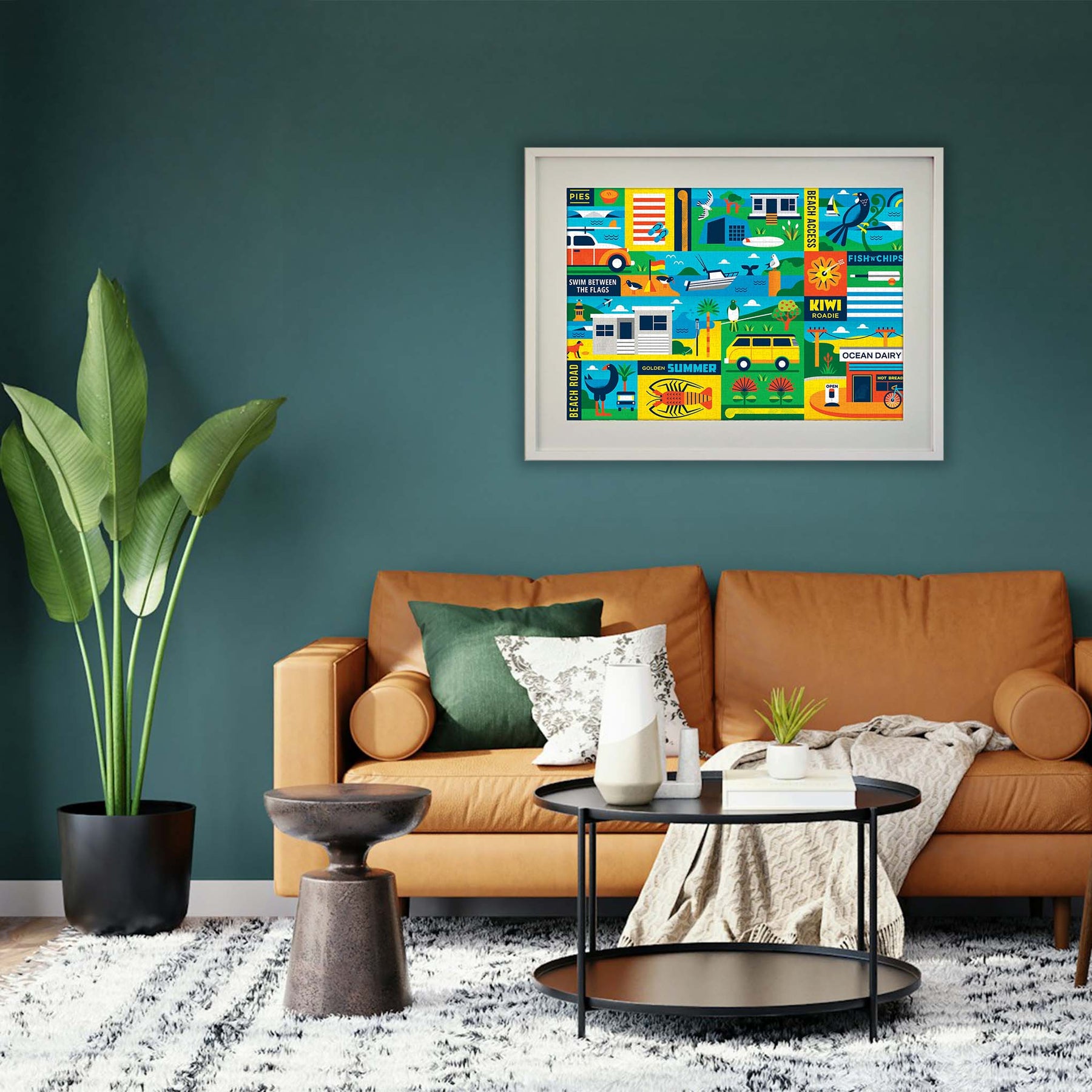 Renowned for his confident and ‘kiwi cool’ aesthetic, Greg’s nostalgic and retro artworks are recognisable by their bright hues, simple geometric shapes and sense of fun. A keen surfer, Greg’s artwork explores all corners of Aotearoa, capturing quintessential moments in time like summer roadies, riding bikes, hitting the waves and hanging out at the beach.