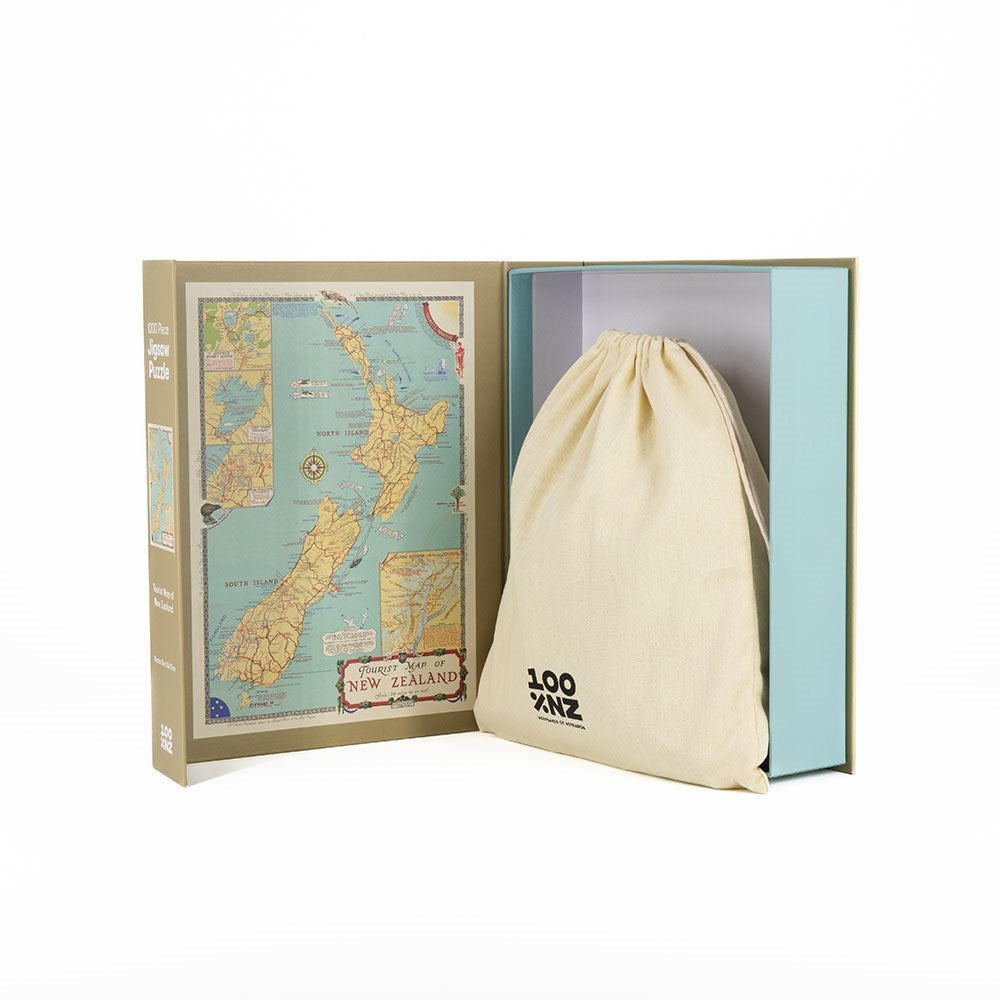 Explore the rich history of New Zealand tourism with our fascinating 1000-piece jigsaw puzzle featuring a vintage tourist map of New Zealand. Packaged in a beautifully designed box, the puzzle comes with a convenient drawstring bag to keep all the pieces organized. This puzzle is a perfect way to unwind and challenge yourself while discovering the charming art and design of vintage New Zealand tourist maps.