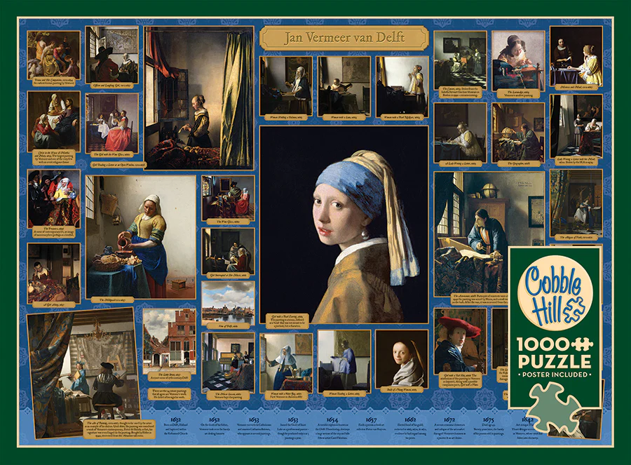 Vemeer highlights the life of Jan Vermeer van Delft, from his baptism to his revival from obscurity nearly 200 years after his death. It is a 1000-piece collage of fine art from the 17th century designed by Cobble Hill Creations.