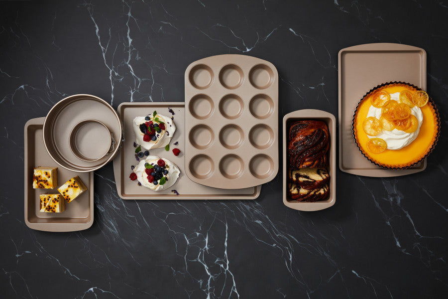 BAKE WITHOUT PTFE, PFOS, PFOA, cadmium or lead, thanks to our healthy ceramicnon-stick coating. Our high performance, two layer non-stick delivers easy release and effortless clean-up every time. The robust, heavy gauge carbon steel heats quickly and evenly for delicious results. Designed with a striking two tone finish, champagne gold and matte black, Ceramabake will make your baking stand out too. With 18 pans in the collection, all your baking needs are covered.