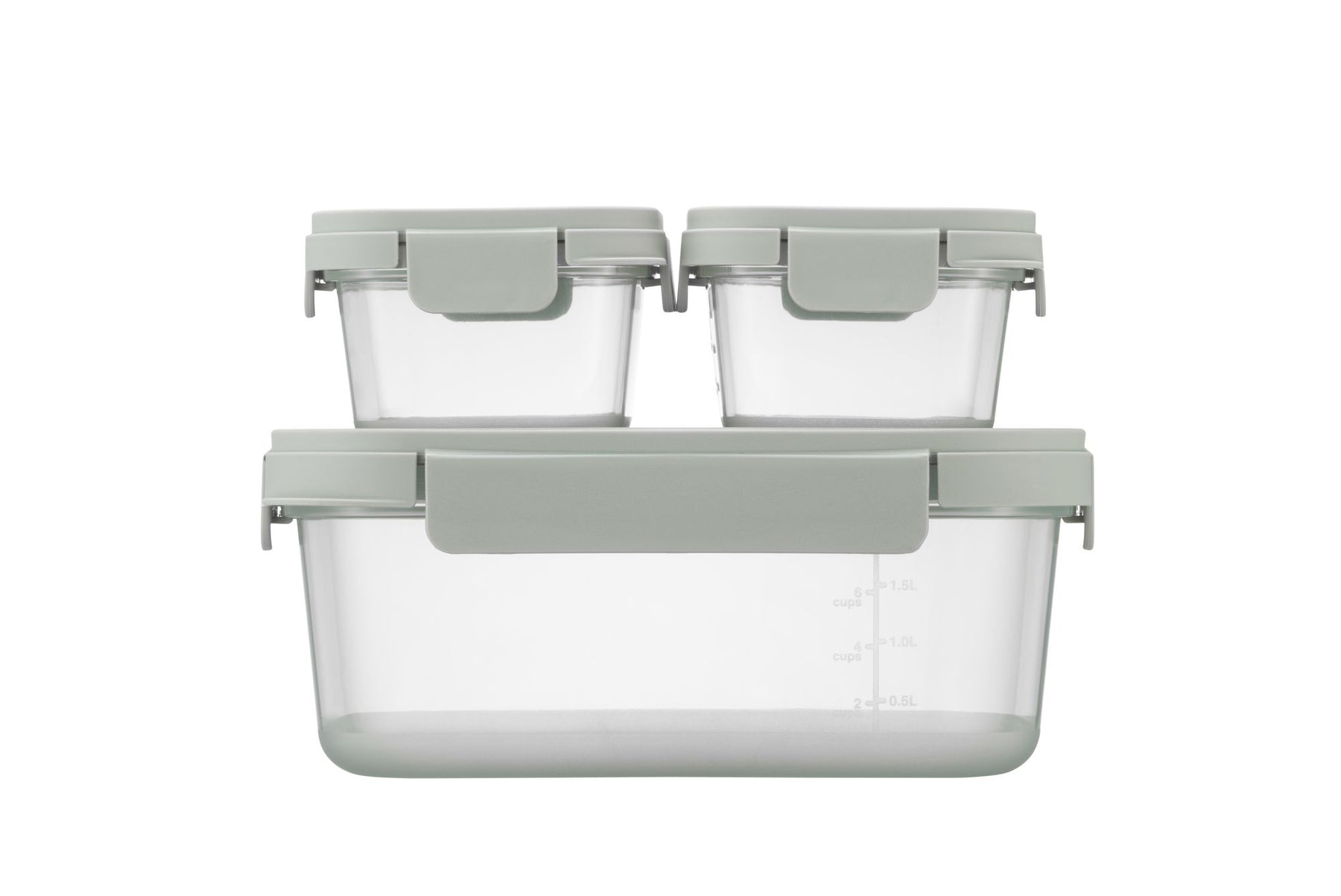 The Nestopia 3pc Rectangular Set features a nestable lid and body, an airtight four-side locking system, and a convenient volume indicator on the side. The lid and body have matching alphabet marks for easy alignment. It's designed for simplicity and perfect for organization and storage. The set is microwave, freezer, and dishwasher safe, as well as BPA-free. Set Includes – 2 x 500ml, 1 x 2.7ml containers.